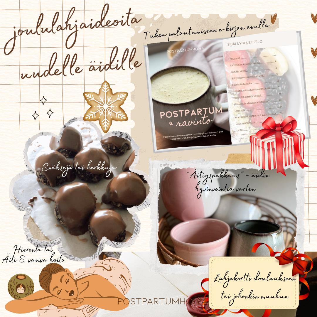 Joulu on aikaa, jolloin haluamme osoittaa rakkautta ja kiitollisuutta lahjoilla. Kun lahjan saajana on odottava tai juuri synnyttänyt äiti, lahjan merkitys kasvaa: postpartum-aika on herkkä, kuormittava ja usein aliarvostettu vaihe elämässä. Sen sijaan, että miettisimme mitä “hauskaa tai tarpeellista” voisimme antaa, kannattaa kysyä: mitä tämä äiti todella tarvitsee voidakseen paremmin?